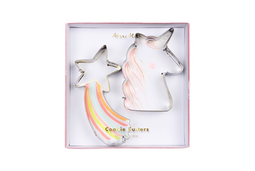Un kit de la collection Meri Meri composé de moules à gâteaux pour réaliser des biscuits en forme de Licorne et étoile filante. Ces ustensiles de cuisine permettent de réaliser un atelier avec les enfants autour des thèmes princesse, licorne, arc en ciel... La Boîte emporte-pièces mesure 17,5 x 18,5 x 3 cm.