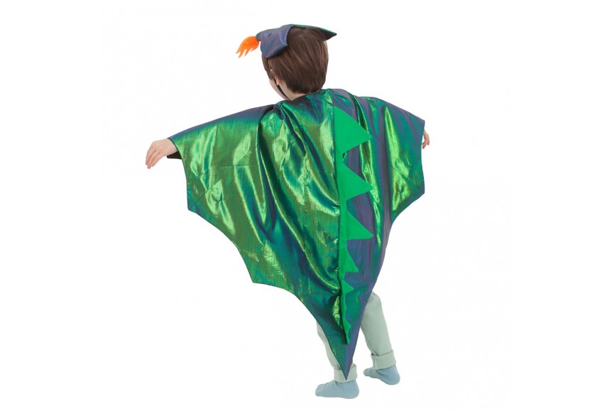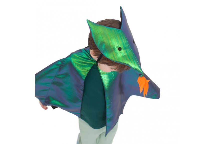 Set composé de 2 éléments. Une belle cape doublée de couleur verte métallique avec crête dorsale en tissu de coton vert et avec sa coiffe en forme de tête de dragon qui crache des flammes néons. Fermetures élastiques et velcro à paillettes noires. Costume cousu à la main.