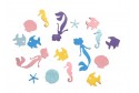 Set de cinquante confetti aux couleurs : bleu lagon, jaune, rose violet et bleu ciel - 5 modèles différents en aléatoire : sirène, coquillage, étoile de mer, hippocampe et poisson