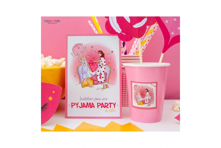 Kit de 6 cartes invitation Pyjama party de format 15 x 10 cm de la collection Happy Pailles pour une soirée de filles. Vendues avec les enveloppes blanches format 11,5 x 16 cm.