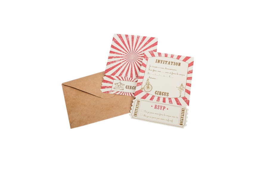 Un set d'invitations de la collection Circus Vintage pour inviter les copain à faire le cirque à l'anniversaire !