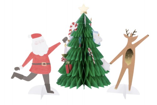 Ravissant sapin de Noël nid d'abeille avec décorations colorées et détails dorés et le Père Noël et le renne. Ouvrez la carte arbre de Noël et posez les deux personnages à côté.