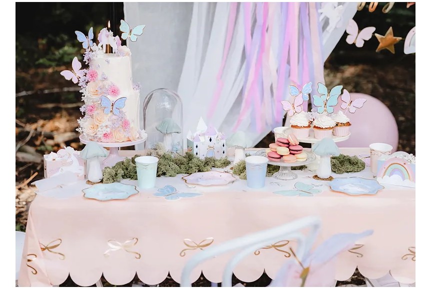 Jolie nappe en papier de couleur orse pâle avec grand noeuds dorés brillants. Se marie parfaitement avec les kits goûters d'anniversaires de filles à découvrir sur le site, idéal communion et baptêmes, ...