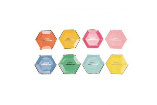 Huit adorables assiettes hexagonales "joyeux anniversaire" de huit couleurs différentes avec galon doré.