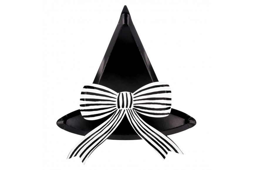 Huit grandes assiettes noires en forme de chapeau de sorcière et son noeud bicolore noir et blanc. A mélanger avec d'autres collections à découvrir sur le site pour une fête chic et tendance.