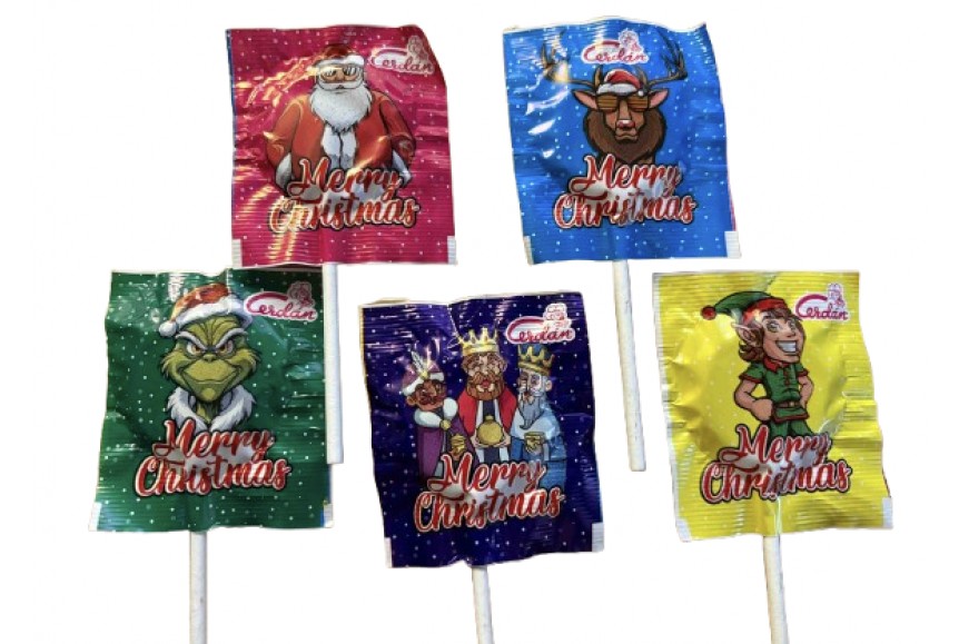 Un délicieux bonbon goût cerise. Sucette ronde et plate ambiance rock&roll de Noël à offrir dans un calendrier de l'avent, emballage cadeau, au pied du sapin, sur la table de fête... pour les fêtes de fin d'année