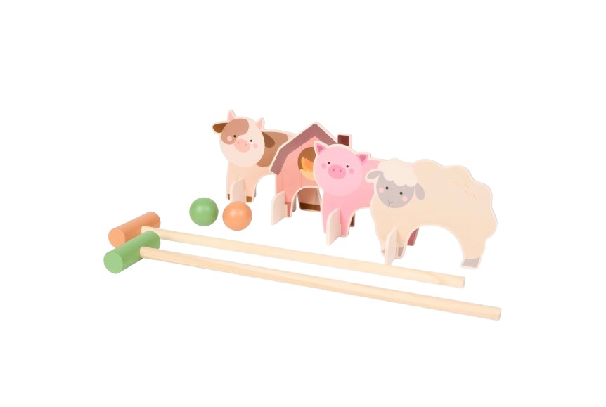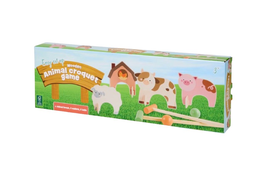 Adorable jeu de croquet composé d'animaux en bois peints pour s'amuser dans le jardin, à la plage, ...