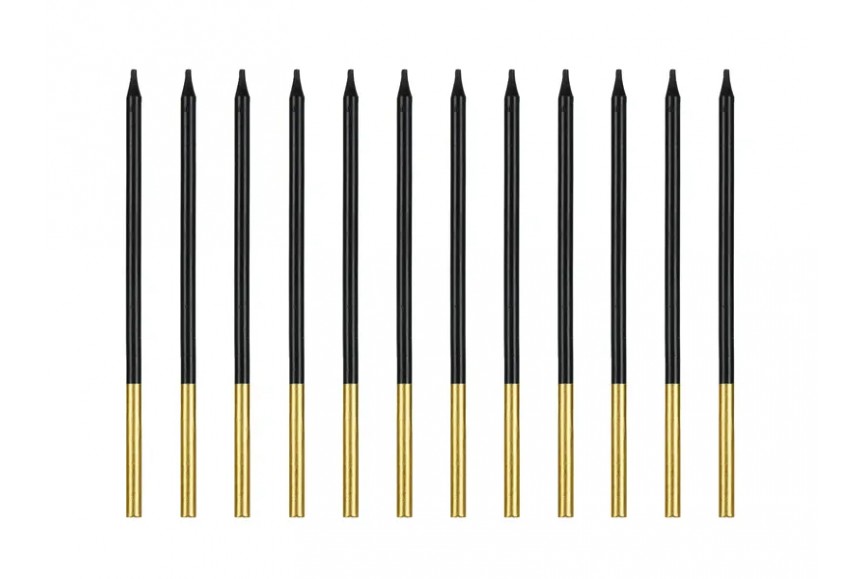 Boîte de dix bougies longues noires et dorées, très festives à poser sur le gâteau pour l'anniversaire.